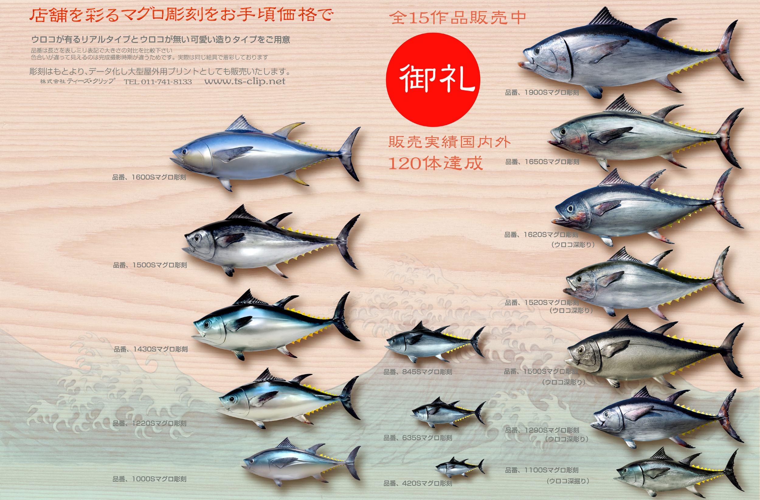 立体物は空きスペースが無いなど購入を控えている方にお勧めマグロと鮭の彫刻に手描き背景画や写真やロゴや文字とを組み合わせてデジタル処理後印刷し納品いたします