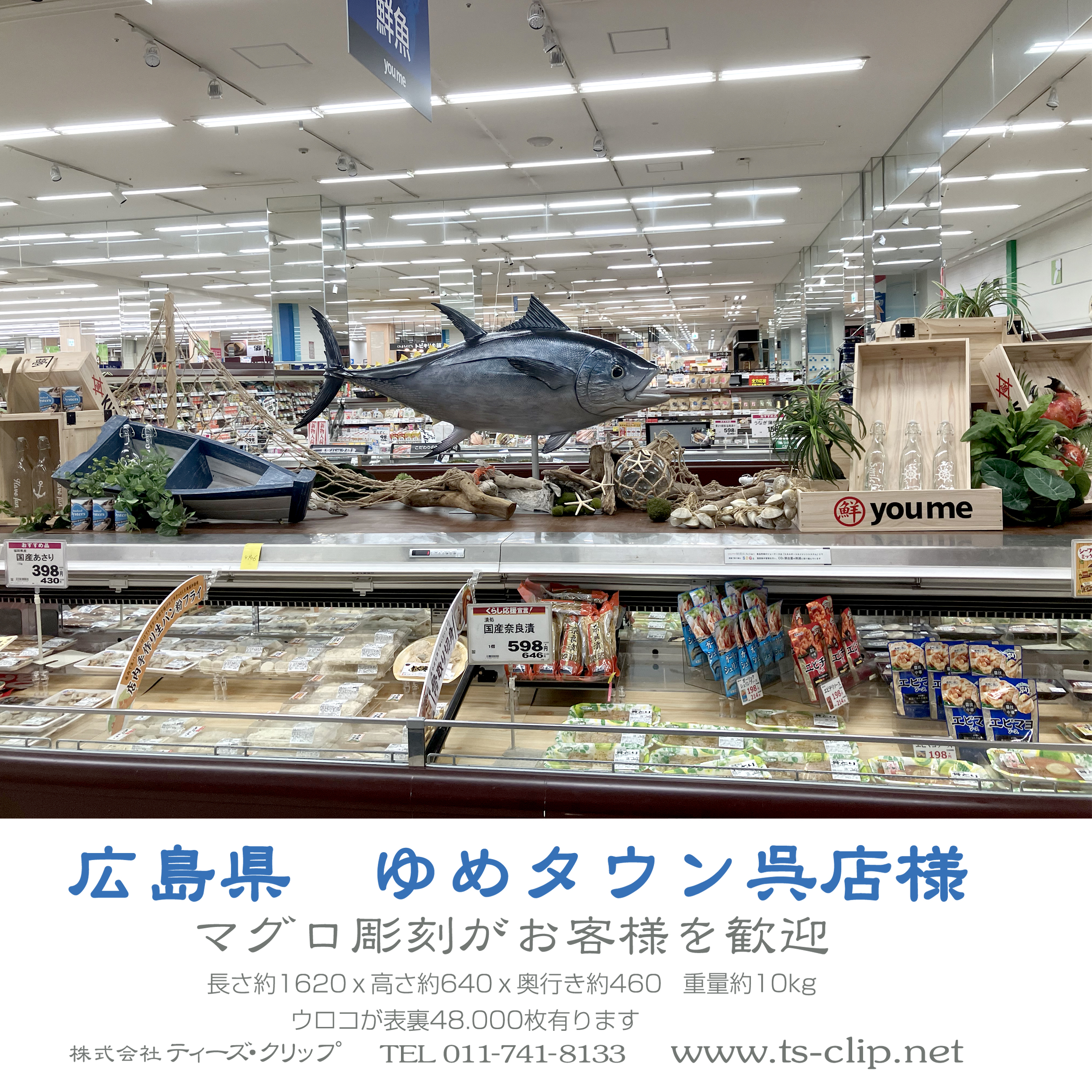 マグロ彫刻-施工例、模型ディスプレイ施工例広島県ゆめタウン呉店様、鮮魚コーナーにマグロ彫刻展示 投稿者: kt更新日:2026/02/182026/02/18 呉市のゆめタウン鮮魚コーナーにお目見え1620ミリメートルのマグロ彫刻